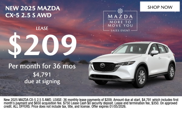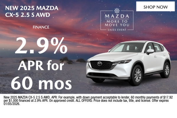 Lease this 2025 Mazda CX-5 2.5 S AWD (Model CX525SXA; VIN JM3KFBAL5S0708931), with $3,107.00 down at $284.22 for 36 months, on approved credit. $0.00 security deposit required. $3,391.22 due at signing - includes 1st mo. payment of $284.22. Total payments: $10,231.92. Must finance through Mazda Financial Services. Selling price $30,248.00. *This charge represents costs and profit to the dealer for items such as inspecting, cleaning and adjusting vehicles, and preparing documents related to the sale or lease. Optional equipment and accessories available, see dealer for details. Price does not include tax, title, or license. Offer assumes these paid at time of sale. Lessee responsible for maintenance, repairs, excessive wear and tear, and $0.15/mile over 10000 miles/year. Early lease termination fee may apply. Option to purchase vehicle at lease end is $18,955.75. Offer cannot be combined with any other offers. Residential restrictions may apply. Available on in-stock units only. 8% off does not include specialty items or retail orders placed before August 1st. See dealer for complete details. Offer Expires: 01/02/2026.