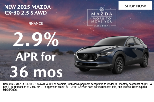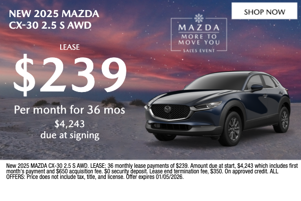 Lease this 2025 Mazda CX-30 2.5 S Preferred AWD (Model C30PFXA; VIN 3MVDMBCM1SM833059), with $3,111.00 down at $240.72 for 36 months, on approved credit. $0.00 security deposit required. $3,351.72 due at signing - includes 1st mo. payment of $240.72. Total payments: $8,665.92. Must finance through Mazda Financial Services. Selling price $27,510.00. *This charge represents costs and profit to the dealer for items such as inspecting, cleaning and adjusting vehicles, and preparing documents related to the sale or lease. Optional equipment and accessories available, see dealer for details. Price does not include tax, title, or license. Offer assumes these paid at time of sale. Lessee responsible for maintenance, repairs, excessive wear and tear, and $0.15/mile over 10000 miles/year. Early lease termination fee may apply. Option to purchase vehicle at lease end is $19,288.20. Offer cannot be combined with any other offers. Residential restrictions may apply. Available on in-stock units only. 8% off does not include specialty items or retail orders placed before August 1st. See dealer for complete details. Offer Expires: 01/02/2026.