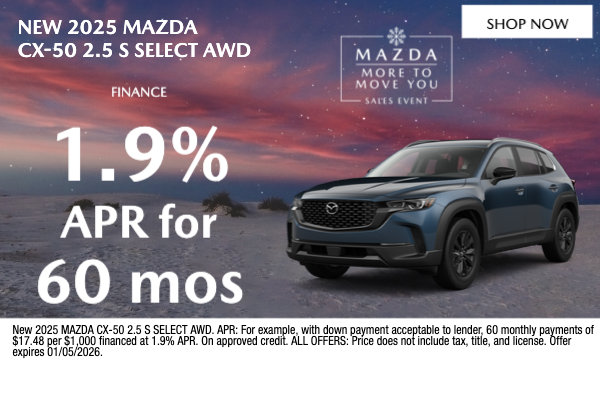 Lease this 2025 Mazda CX-50 2.5 S Premium AWD (Model C50PRXA; VIN 7MMVABDM9SN390548), with $3,631.00 down at $253.49 for 36 months, on approved credit. $0.00 security deposit required. $3,884.49 due at signing - includes 1st mo. payment of $253.49. Total payments: $9,125.64. Must finance through Mazda Financial Services. Selling price $32,310.00. *This charge represents costs and profit to the dealer for items such as inspecting, cleaning and adjusting vehicles, and preparing documents related to the sale or lease. Optional equipment and accessories available, see dealer for details. Price does not include tax, title, or license. Offer assumes these paid at time of sale. Lessee responsible for maintenance, repairs, excessive wear and tear, and $0.15/mile over 10000 miles/year. Early lease termination fee may apply. Option to purchase vehicle at lease end is $21,786.00. Offer cannot be combined with any other offers. Residential restrictions may apply. Available on in-stock units only. 8% off does not include specialty items or retail orders placed before August 1st. See dealer for complete details. Offer Expires: 01/02/2026.