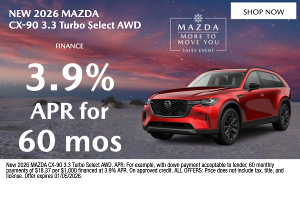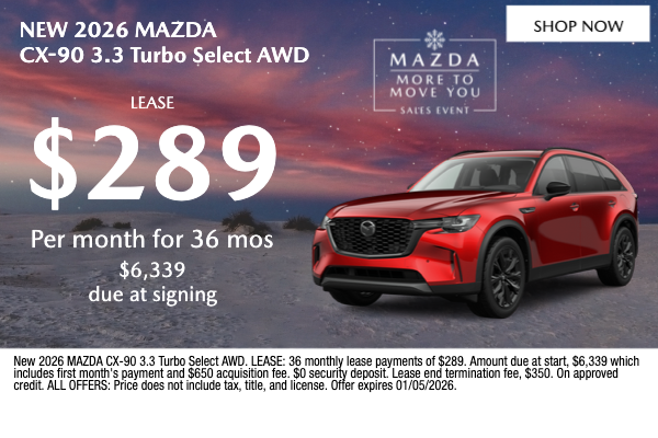Lease this 2026 Mazda CX-90 3.3 Turbo Select AWD (Model C90SEXA; VIN JM3KKAHD4T1357462), with $4,080.00 down at $360.76 for 30 months, on approved credit. $0.00 security deposit required. $4,440.76 due at signing - includes 1st mo. payment of $360.76. Total payments: $10,822.80. Must finance through Mazda Financial Services. Selling price $39,740.00. *This charge represents costs and profit to the dealer for items such as inspecting, cleaning and adjusting vehicles, and preparing documents related to the sale or lease. Optional equipment and accessories available, see dealer for details. Price does not include tax, title, or license. Offer assumes these paid at time of sale. Lessee responsible for maintenance, repairs, excessive wear and tear, and $0.15/mile over 10000 miles/year. Early lease termination fee may apply. Option to purchase vehicle at lease end is $27,339.35. Offer cannot be combined with any other offers. Residential restrictions may apply. Available on in-stock units only. 8% off does not include specialty items or retail orders placed before August 1st. See dealer for complete details. Offer Expires: 01/02/2026.